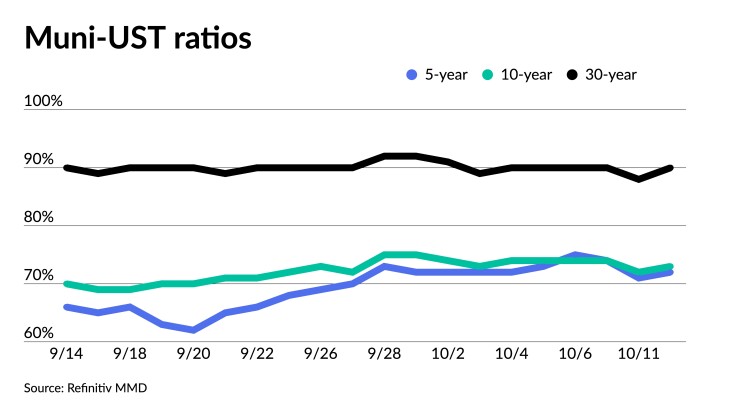 Ratios fell as a result. The two-year muni-to-Treasury ratio Thursday was at 70%, the three-year was at 70%, the five-year at 70%, the 10-year at 71% and the 30-year at 87%, according to Refinitiv Municipal Market Data’s 3 p.m., ET, read. ICE Data Services had the two-year at 71%, the three-year at 73%, the five-year at 72%, the 10-year at 73% and the 30-year at 90% at 4 p.m.