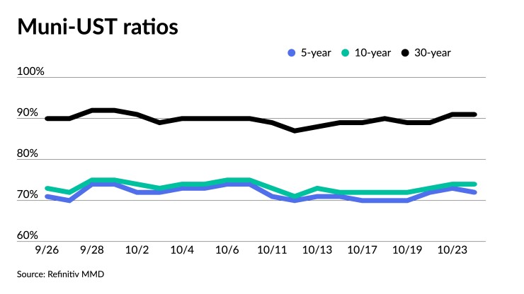 The two-year muni-to-Treasury ratio Tuesday was at 71%, the three-year was at 72%, the five-year at 72%, the 10-year at 74% and the 30-year at 91%, according to Refinitiv Municipal Market Data’s 3 p.m., ET, read. ICE Data Services had the two-year at 73%, the three-year at 74%, the five-year at 72%, the 10-year at 73% and the 30-year at 90% at 3:30 p.m.