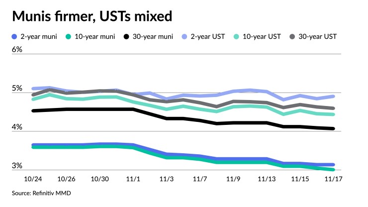 Municipals improved Friday to close out a week of more gains despite some U.S. Treasury volatility, positioning the asset class to see historically high returns for the month. Equities ended up near the end of the trading session.