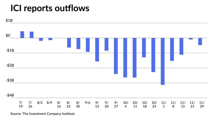Municipal mutual fund losses continued last week as the Investment Company Institute Wednesday reported investors pulled only $475 million from the funds in the week ending Nov. 29 after $97 million of outflows the previous week.