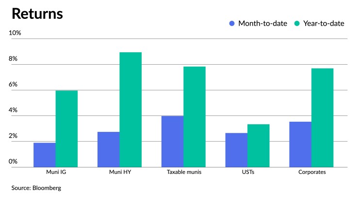 Munis are returning 5.96% year-to-date and 1.90% month-to-date, while USTs are returning 3.34% so far this year and 2.66% through Monday.