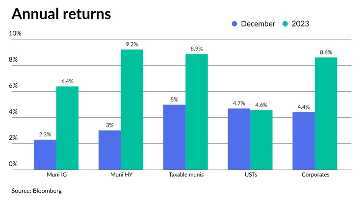 Municipals are poised to close out 2023 returning more than 6% for investment grades, above 9% and taxable munis in the black at nearly 9%.