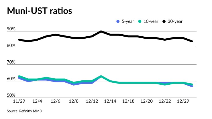 The two-year muni-to-Treasury ratio Friday was at 56%, the three-year at 57%, the five-year at 57%, the 10-year at 58% and the 30-year at 84%, according to Refinitiv Municipal Market Data’s 1 p.m., EST, read.