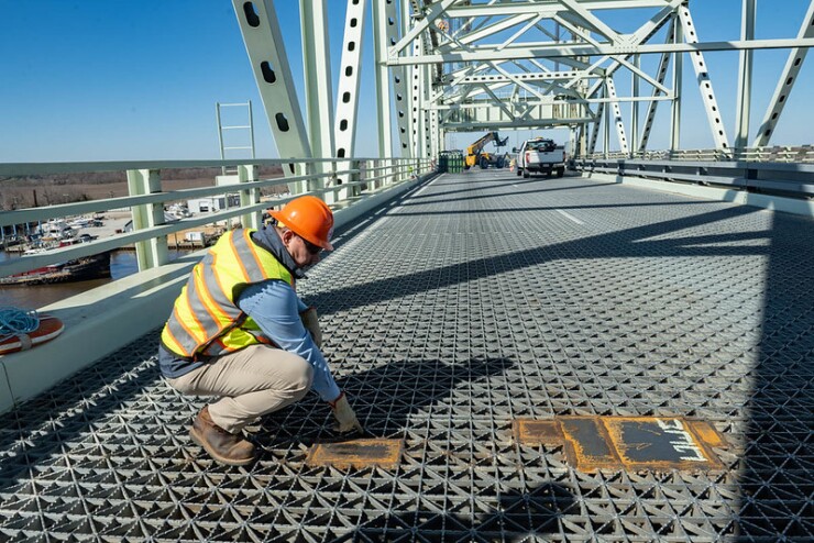 A construction worker performs repairs on the Cape Fear Memorial Bridge as part of the preservation project by the N.C. Department of Transportation. The project won a $242 million federal grant.