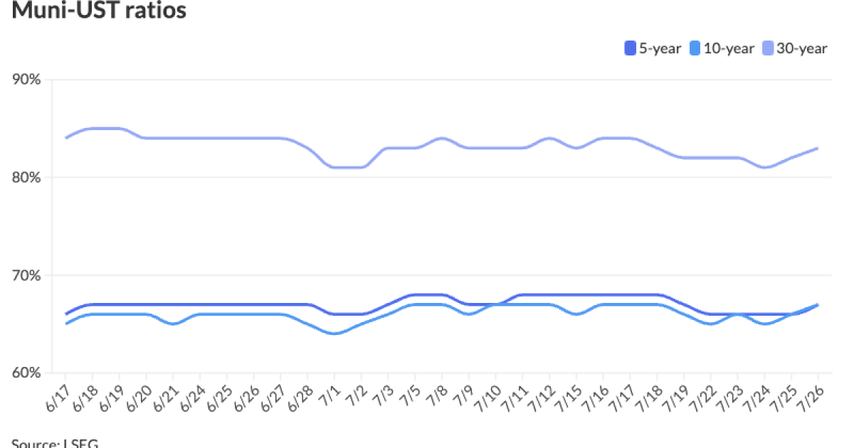 The two-year muni-to-Treasury ratio Friday was at 65%, the three-year at 66%, the five-year at 67%, the 10-year at 67% and the 30-year at 83%, according to Refinitiv Municipal Market Data’s 3 p.m. EST read. ICE Data Services had the two-year at 64%, the three-year at 66%, the five-year at 67%, the 10-year at 66% and the 30-year at 81% at 3:30 p.m.