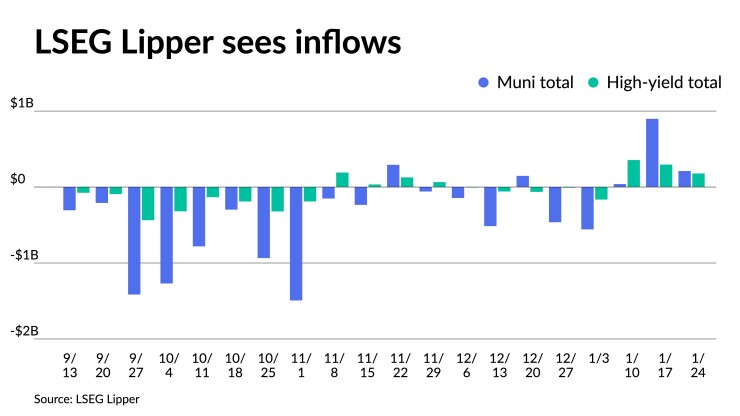 LSEG Lipper reported Thursday that investors added $210.6 million to municipal bond mutual funds for the week ending Wednesday after inflows of $898 million the week prior.